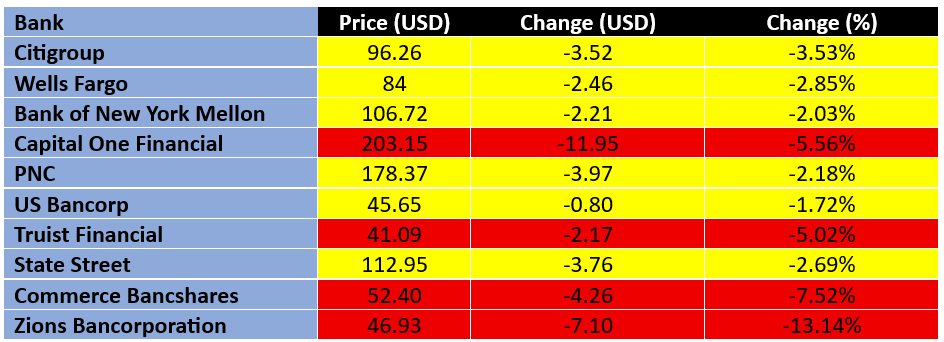 The Dow Jones U.S. Banks Index fell by around 3.5% on the day, with individual banks posting notable losses. Zions Bancorporation suffered the steepest drop of 13.14%, followed by Commerce Bancshares with a 7.52% decline. Other large lenders such as Capital One Financial and Truist Financial also saw declines exceeding 5%. This sell-off triggered a global ripple effect, impacting banking stocks in Europe and Asia as well. Meanwhile, safe-haven assets like gold hit fresh highs as investors sought refuge from market volatility.
