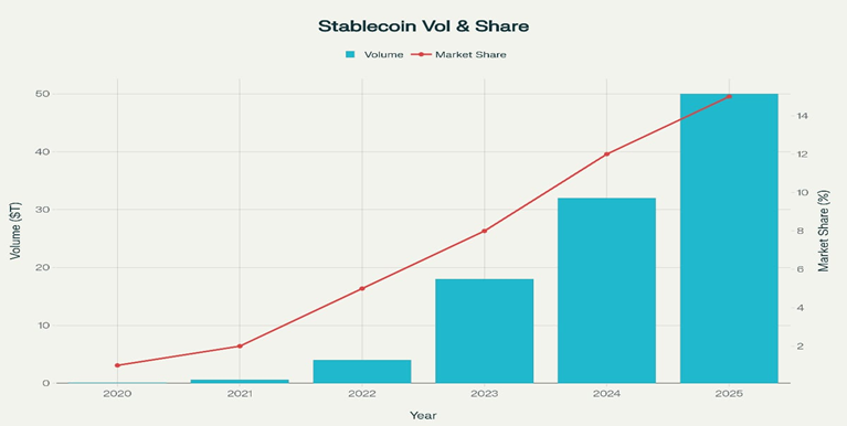 - Stablecoin transaction volume surged from $100B in 2020 to $32T in 2024, with projections hitting $50T in 2025, capturing nearly 15% of global cross-border payments.