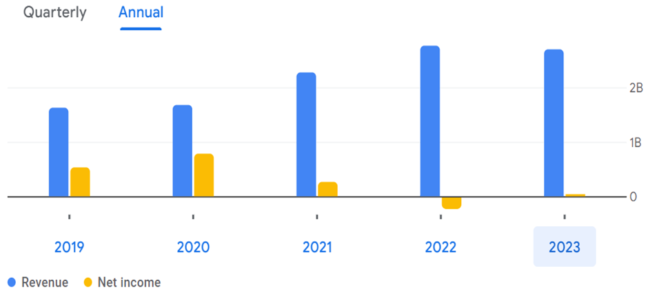 Selling, general, and administrative expenses have remained relatively stable, which is a positive sign of controlled operational costs. Depreciation and amortization expenses have increased, reflecting a larger asset base and possibly higher capital expenditures. Operating income has improved from US $343 million in 2020 to US $477 million in 2023, indicating better operational efficiency. However, net income shows significant volatility, peaking at US $782 million in 2019 but turning negative in 2022 before recovering to US $28 million in 2023.