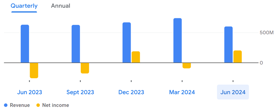 The company’s financial performance has shown significant variability across the observed periods. While total revenue has fluctuated, ranging from approximately US $598.6 million in June 2024 to US $737.1 million in March 2024, the gross profit has remained relatively stable, indicating consistent profit margins despite revenue changes. Operating expenses have gradually increased, reaching US $406.8 million in June 2024, which could be due to higher operational costs or strategic investments. Despite these rising expenses, the company has generally maintained positive operating income, though it saw a decrease from US $141 million in March 2024 to US $82.2 million in June 2024.
