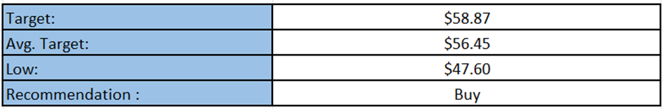 Right now, the company is trading at US $50.81, with a 1-year projected target of around US $58.87 and a low estimation of US $47.60; the average price target will be US $56.45.