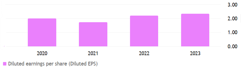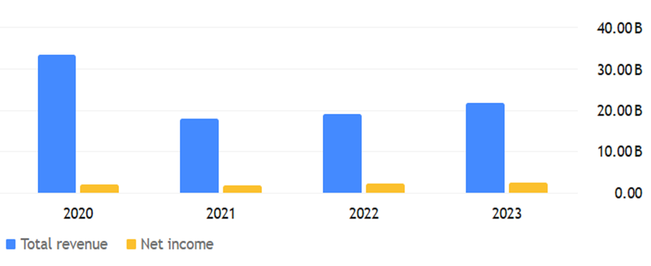 Exelon Corporation’s financial performance over the past four years shows consistent revenue growth, increasing from US $16.66 billion in 2020 to US $21.73 billion in 2023, reflecting a 30% increase. The company’s gross profit also improved significantly, rising from US $6.3 billion in 2020 to US $8.93 billion in 2023, demonstrating strong operational efficiency. Operating income grew 83% over the same period, reaching US $4.02 billion in 2023, despite rising costs. Net income applicable to common shareholders has remained stable, reaching US $2.33 billion in 2023, up from US $1.96 billion in 2020. However, interest expenses have increased alongside higher debt, which could impact future profitability. Exelon’s strong revenue growth, improving margins, and stable net income indicate solid financial health, making it an attractive investment for long-term stability and dividends.