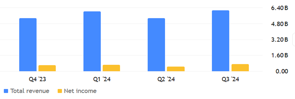 Exelon Corporation’s quarterly financials for 2024 demonstrate steady revenue growth and profitability, with total revenue reaching US $6.15 billion in Q3 2024, up from US $5.37 billion in Q4 2023. The gross profit margin remains strong, averaging 39%-41% across the quarters, reflecting operational efficiency.