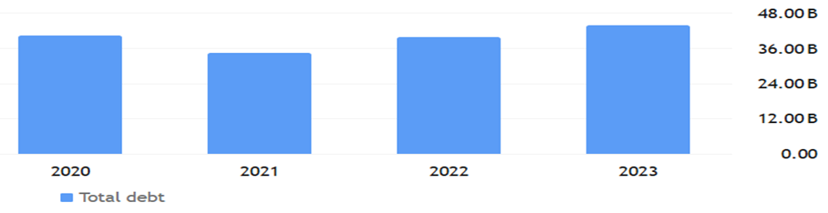 Exelon’s total debt has fluctuated over the past few years. In 2023, the company’s total debt was US $44.01 billion, showing an increase from US $40.05 billion in 2022. This marks a US $3.46 billion rise. In 2021, total debt was US $34.54 billion, indicating a significant increase from the previous year, while in 2020, the debt was US $40.63 billion, slightly higher than in 2022. The increase in debt in 2023 may be linked to ongoing investments and infrastructure projects