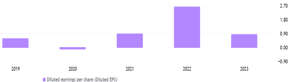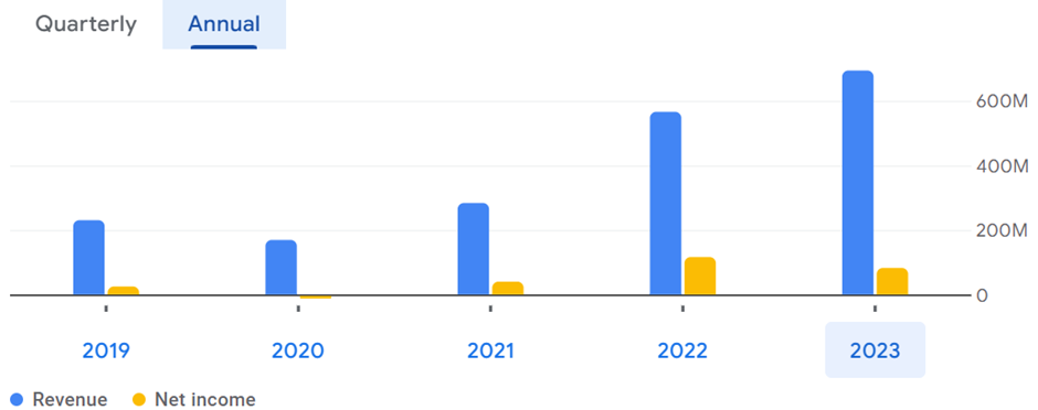 Operating income, which turned from a loss of US $19.1 million in 2020 to a profit of US $95.2 million in 2023, also highlights the company’s efficiency. However, it did experience a decline from the US $150.4 million posted in 2022, signaling rising costs as a challenge. Additionally, interest expenses grew from US $1.2 million in 2020 to US $8.9 million in 2023, likely due to increased debt to support expansion.