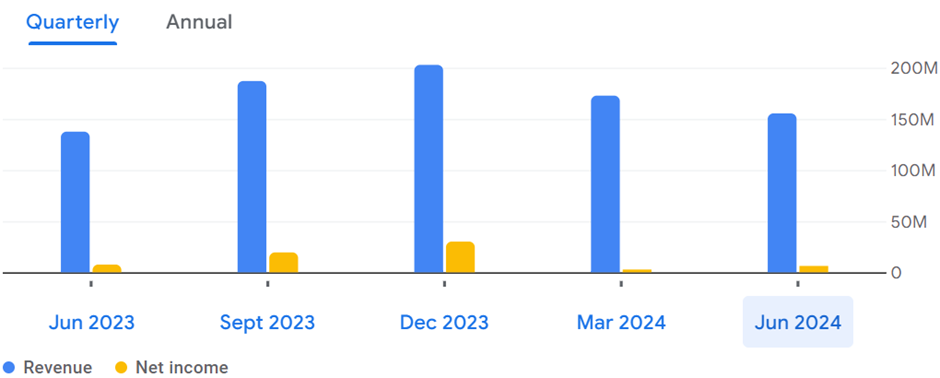 Ramaco Resources has experienced fluctuating financial performance from Q3 2023 to Q2 2024, with notable declines in revenue and profitability. Revenue dropped from US $202.7 million in Q4 2023 to US $155.3 million in Q2 2024, reflecting potential challenges in market demand or coal pricing. There is a significant contraction in gross profit, which fell from US $63.3 million in Q4 2023 to US $32.5 million by Q2 2024, putting pressure on profit margins.
