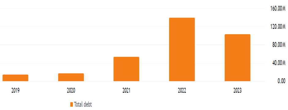 Liquidity has improved as well, with cash and cash equivalents rising dramatically from US $5.3 million in 2020 to US $42 million in 2023, indicating strong financial health and flexibility to manage short-term obligations. In terms of debt, the company experienced fluctuating total debt levels, peaking at US $138.1 million in 2022 before reducing to US $100.6 million by the end of 2023. This decline suggests an effort to deleverage and improve financial stability, although total debt remains significantly higher than in 2020. Additionally, retained earnings in 2022 and 2023 were US $140 million and US $91.9 million.